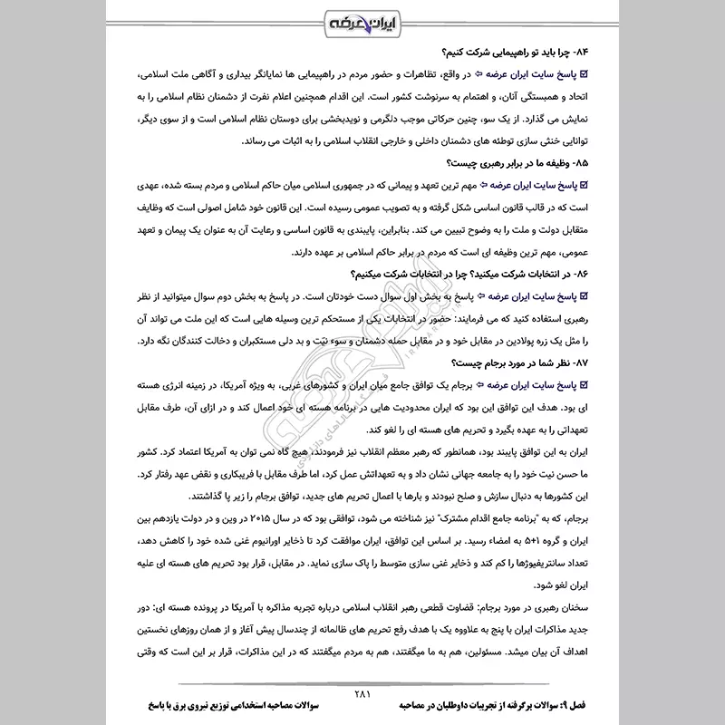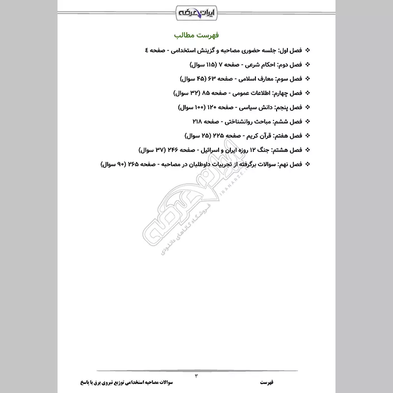 گروه آموزشی ایران عرضه اقدام به ارائه بسته ای جدید برای آزمون استخدامی شرکت توزیع نیروی برق (اداره برق) نموده است. از مزیت های اصلی این بسته ارائه جزوه مصاحبه به همراه نمونه سوالات پرتکرار با پاسخنامه تشریحی میباشد. از دیگر ویژگی های برجسته این بسته دانلود فوری فایل PDF و امکان چاپ محتوا جهت مطالعه آسان است و این مزیت مختص شما داوطلبان عزیز می باشد. نکاتی که در بسته مصاحبه گنجانده شده است مفید و ارزشمند بوده و شما را قادر میسازد بتوانید تا جایی که میتوانید آمادگی بیشتری برای شرکت در مصاحبه و گزینش (عقیدتی و سیاسی) کسب نمایید. ما به کیفیت مطالب خود اطمینان داریم لذا پیشنهاد می کنیم از این فرصت طلایی استفاده کنید و با خرید و مطالعه این منبع معتبر، کیفیت مطالعه خود را در زمینه منابع مصاحبه استخدامی شرکت برق بالا برده و با خاطری آسوده در جلسه ارزیابی شرکت کنید.