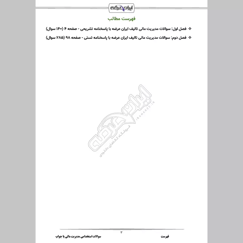 یکی از دروس مهم مدیریت درس مدیریت مالی می باشد که در بسیاری از آزمون های استخدامی سراسری یکی از منابع اعلامی می باشد. برای آمادگی شما عزیزان برای این درس این بسته که حاوی اصل سوالات و نمونه سوالات طراحی شده مطابق سرفصل های سازمان سنجش میباشد، توسط گروه ایران عرضه تهیه و در اختیار بازدیدکنندگان عزیز قرار گرفته است. این بسته برای تمامی آزمون های استخدامی دولتی و خصوصی (آموزش و پرورش، دستگاه های اجرایی، بانک ها و سایر سازمان ها) که در آن درس مدیریت مالی به عنوان منبع اعلام شده است، مفید می باشد.