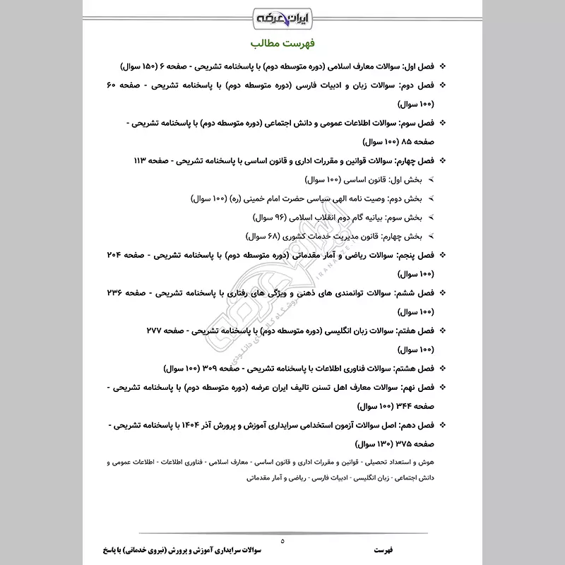 گروه آموزشی ایران عرضه اقدام به ارائه بسته ای کارآمد و مفید برای آمادگی در آزمون استخدامی سرایداری آموزش و پرورش (نیروی خدماتی) نموده است. از مزیت های اصلی این بسته بهره گیری از اصل سوالات آزمون های استخدامی ادوار گذشته آموزش و پرورش، فراگیر و سایر سازمان های دولتی می باشد. همچنین از سایر مزیت های این بسته ارائه سوالات کلیدی مهم و پرتکرار به همراه پاسخنامه کاملا تشریحی در قالب فایل PDF قابل پرینت است. در نظر داشته باشید که قدم اول برای استخدام، مطالعه هدفمند مطالب مهم است، لذا پیشنهاد می کنیم با خرید محصولات باکیفیت و اثربخش ایران عرضه موفقیت خود را در آزمون استخدامی نیروی خدمتگزار آموزش و پرورش تضمین کنید.