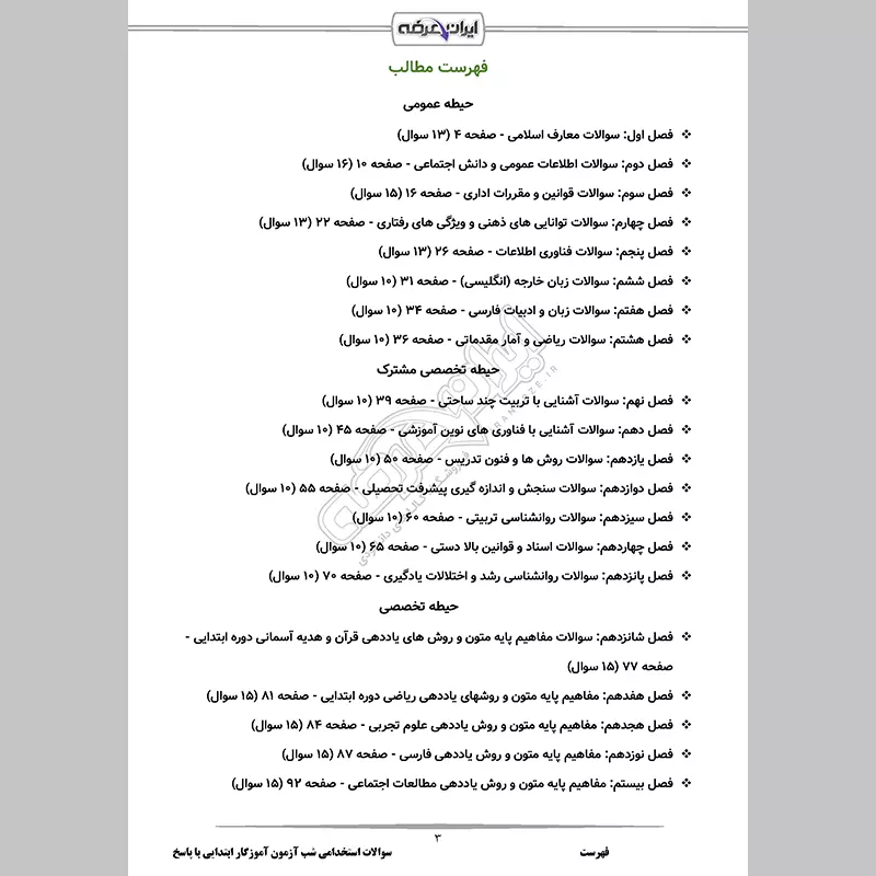 بسته سوالات شب آزمون آموزگار ابتدایی شامل سوالات تالیفی ایران عرضه برای آزمون استخدامی آموزش و پرورش می باشد که منطبق با منابع جدید اعلام شده توسط سازمان جهاد دانشگاهی، تالیف شده است. توضیحات بسته: