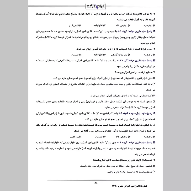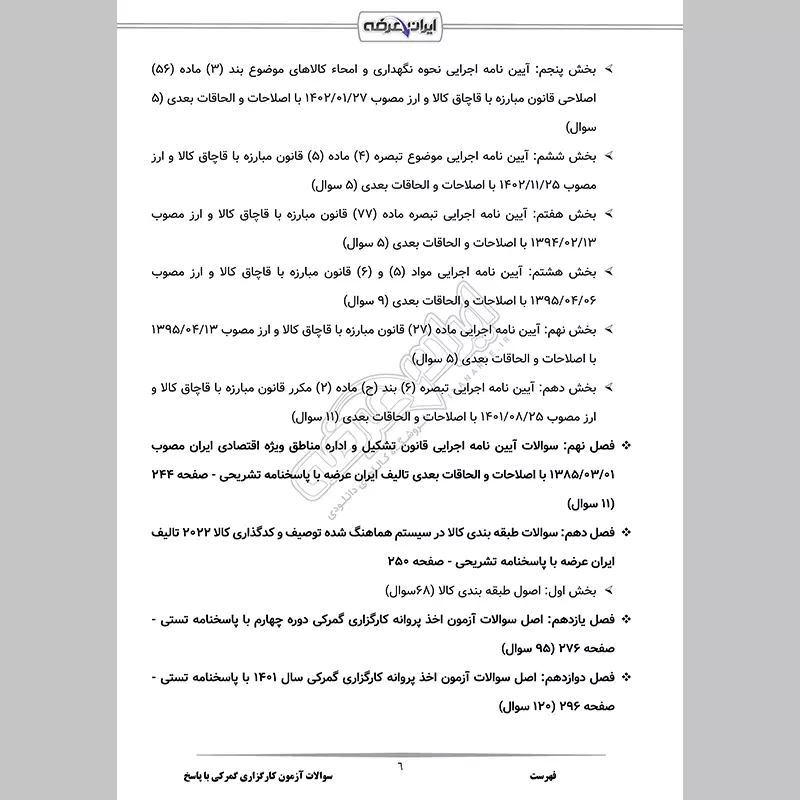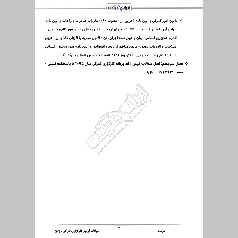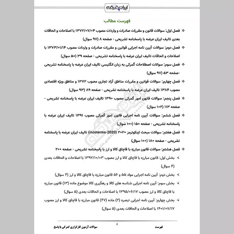 گروه آموزشی ایران عرضه اقدام به ارائه سوالات برای آزمون اخذ پروانه کارگزاری گمرکی نموده است. این مجموعه حاوی نمونه سوالات استاندارد و طبقه بندی شده به همراه پاسخنامه تشریحی دقیق و کامل است. از سایر مزیت های اصلی این بسته دارا بودن اصل سوالات آزمون های ادوار گذشته است. کارشناسان ما بر این باورند که این مجموعه عاملی مهم برای آمادگی شما امتحان حق العمل کاری و کارت بازرگانی بوده و قدمی مهم برای موفقیت در آن خواهد بود. با این پکیج، نه تنها به سوالات آزمون مسلط میشوید، بلکه مهارت های خود را نیز ارتقا می دهید و با آمادگی بیشتر و خیالی آسوده در آزمون شرکت خواهید کرد.