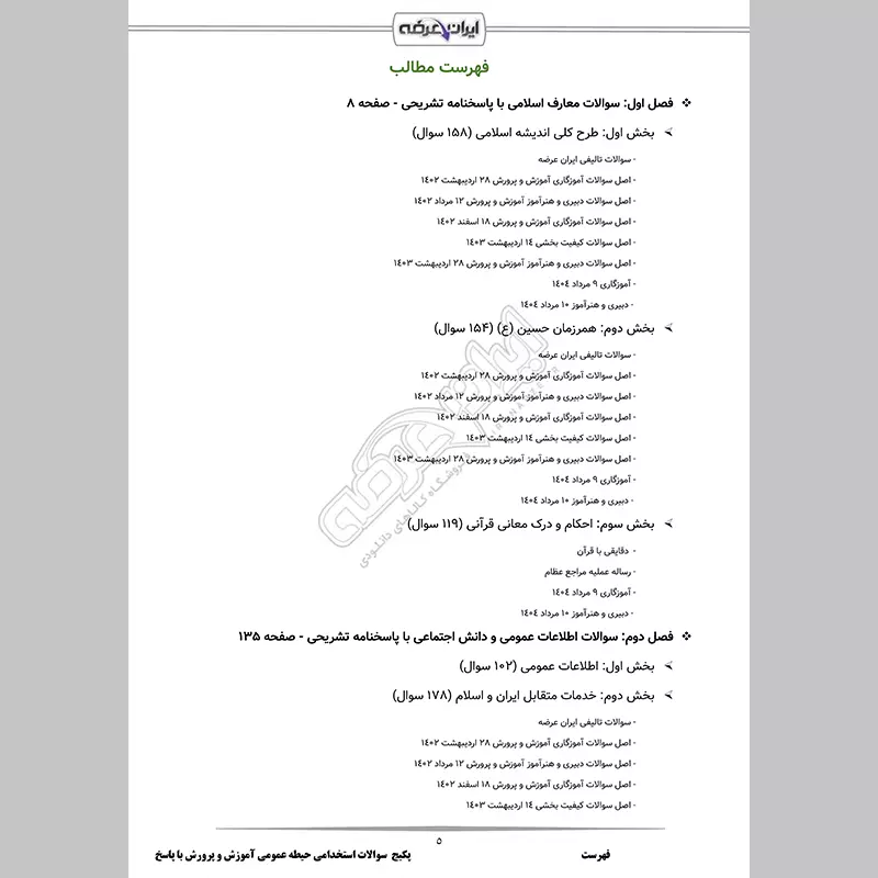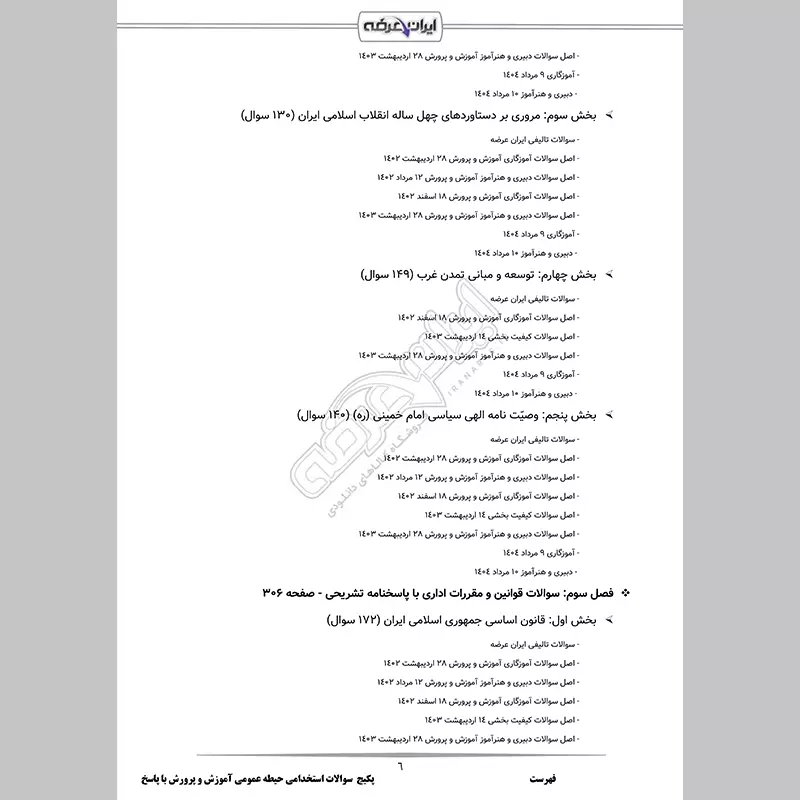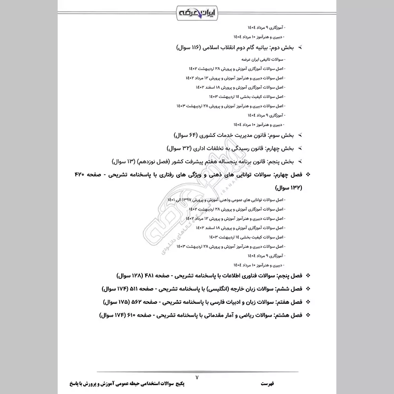 گروه آموزشی ایران عرضه اقدام به ارائه پکیج جامع نمونه سوالات عمومی آزمون استخدامی آموزش و پرورش کرده است تا داوطلبان با استفاده از آن، نه تنها بر سوالات آزمون مسلط شوند، بلکه مهارتهای تحلیلی و پاسخگویی خود را نیز ارتقا دهند. این مجموعه حاوی اصل سوالات آزمون استخدامی آموزش و پرورش و همچنین نمونه سوالات تالیفی با پاسخنامه تستی و تشریحی بوده و نیز دارای قابلیت پرینت می باشند. کارشناسان ما بر این باورند که این مجموعه عاملی مهم برای آمادگی شما در این آزمون بوده و قدمی مهم برای موفقیت در آن خواهد بود.