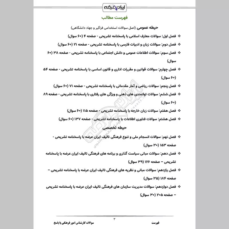 گروه آموزشی ایران عرضه اقدام به ارائه بسته ای جدید برای آمادگی در آزمون استخدامی کارشناس امور فرهنگی نموده است، این مجموعه شامل سوالات استخدامی کارشناس امور فرهنگی با قابلیت پرینت و دارای پاسخنامه میباشند. کارشناسان ما بر این باورند که این مجموعه عاملی مهم برای آمادگی شما در این آزمون بوده و قدمی مهم برای موفقیت در آن خواهد بود.