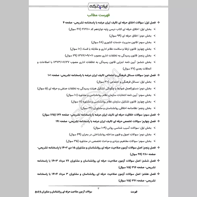 گروه آموزشی ایران عرضه، بسته کاملی از نمونه سوالات آزمون صلاحیت حرفه ای روانشناسان و مشاوران را برای شما تدارک دیده است که با این بسته، نه تنها به سوالات آزمون مسلط می شوید، بلکه مهارت های خودتان را نیز ارتقا میدهید. این مجموعه شامل سوالات تالیفی ایران عرضه بر اساس سرفصل ها و منابع آزمون صلاحیت حرفه ای روانشناسان (صلاحیت نظام روانشناسی) است. از جمله ویژگی های برجسته فایل ارائه اصل سوالات آزمون های سال 1402 و 1403 به همراه پاسخنامه تشریحی کامل برای درک عمیق مطالب و نیز دارا بودن قابلیت پرینت برای مطالعه آسان میباشد. سوالات تستی طراحی شده این بسته مطابق با عناوین اعلام شده در دفترچه ازمون صلاحیت حرفه ای است. کارشناسان ما بر این باورند که این مجموعه عاملی مهم برای آمادگی شما در امتحان صلاحیت حرفه ای روانشناسی بوده و قدمی مهم برای موفقیت در آن خواهد بود. با حل این سوالات، به طور کامل به سبک سوالات آزمون مسلط میشوید.
