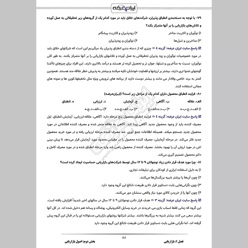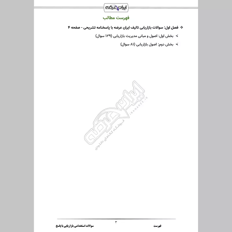 گروه آموزشی ایران عرضه اقدام به ارائه بسته ای جدید برای درس اصول و مبانی مدیریت بازاریابی نموده است. این مجموعه شامل سوالات تالیفی ایران عرضه به همراه پاسخنامه تشریحی با قابلیت پرینت میباشد. کارشناسان ما بر این باورند که این مجموعه عاملی مهم برای آمادگی شما آزمون های مختلف بوده و قدمی مهم برای موفقیت در آن خواهد بود. با حل این سوالات، به طور کامل به سبک سوالات آزمون مسلط میشوید. کارشناسان ما به شما کمک میکنند تا نقاط قوت و ضعف خود را شناسایی کرده و بر روی آنها کار کنید. ما به کیفیت مطالب خود اطمینان داریم و به شما کمک میکنیم تا بهترین نتیجه را کسب کنید.