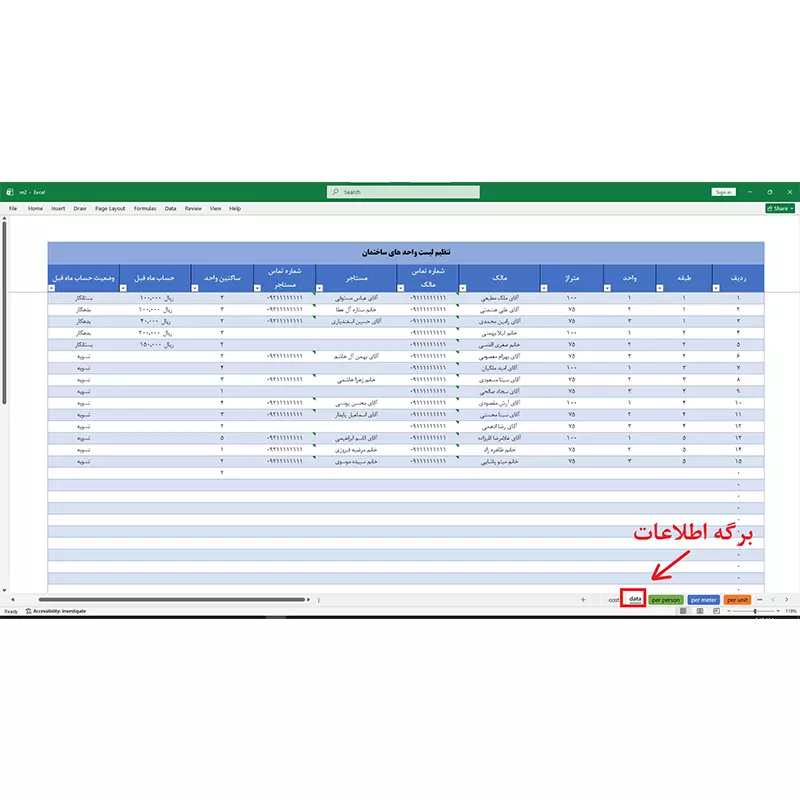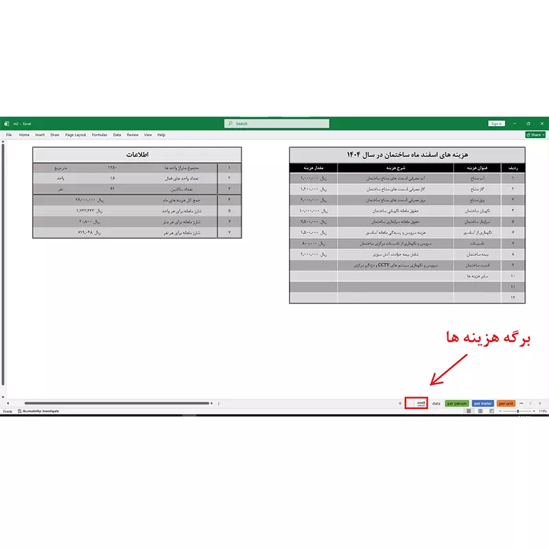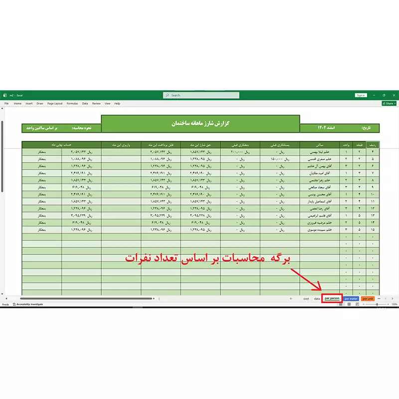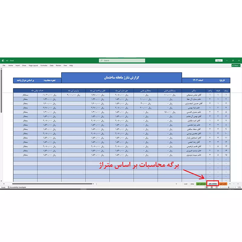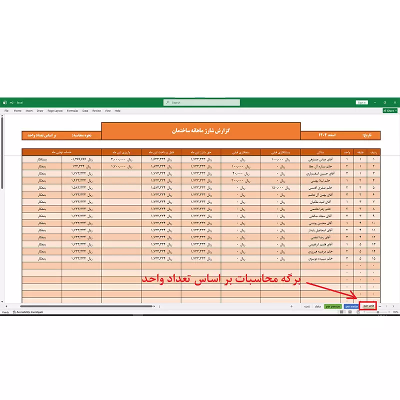 تیم ایران عرضه با توجه به گسترش آپارتمان نشینی و تعداد واحدهای مسکونی در شهرها، اقدام به ارائه فایل اکسل آماده برای محاسبه شارژ ساختمان نموده است. این فایل شامل نسخه خام شارژ ساختمان در نرم افزار اکسل با قابلیت ویرایش اطلاعات می باشد. از مزیت های اصلی این فایل، فرمول بندی دقیق در سلول های جدول جهت محاسبه دقیق مبالغ است. از سایر مزیت های این بسته محاسبه بر اساس تعداد واحدها، متراژ واحدهای مسکونی و افراد ساکن در ساختمان است. برای استفاده از این نسخه نرم افزار ساده و پرکاربرد کافی است داده های اولیه که شامل انواع هزینه ها، مشخصات ساکنین است را در جدول وارد نمایید. لازم به ذکر است که با خرید این فایل، از پشتیبانی رایگان نیز بهره مند خواهید شد. امیدواریم این فایل برای شما کاربردی باشد. در صورت مواجه با هر گونه مشکل یا سوالی هنگام کار کردن با فایل اکسل شارژ ساختمان میتوانید با ارسال تیکت پشتیبانی در سایت یا ارتباط با پشتیبانی از طریق پیامرسان های اینترنتی، مشکلات و سوالات خود را با ما درمیان بگذارید.
